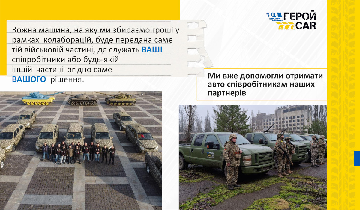 Важливо, що партнери мають можливість вирішувати, у який саме підрозділ Збройних сил буде направлене авто. Зазвичай пікапи спрямовують у ті підрозділи, де служать працівники компанії. Таким чином бізнеси демонструють свою соціально-корпоративну відповідальність. Зустрічала дослідження, згідно з якими близько 60% компаній спрямовують фінансову допомогу армії та підтримують власних співробітників, що перебувають в лавах ЗСУ. Важливо, що проєкт ГеройCar має можливість допомагати адресно, безпосередньо тому підрозділу ЗСУ, який обирає компанія.