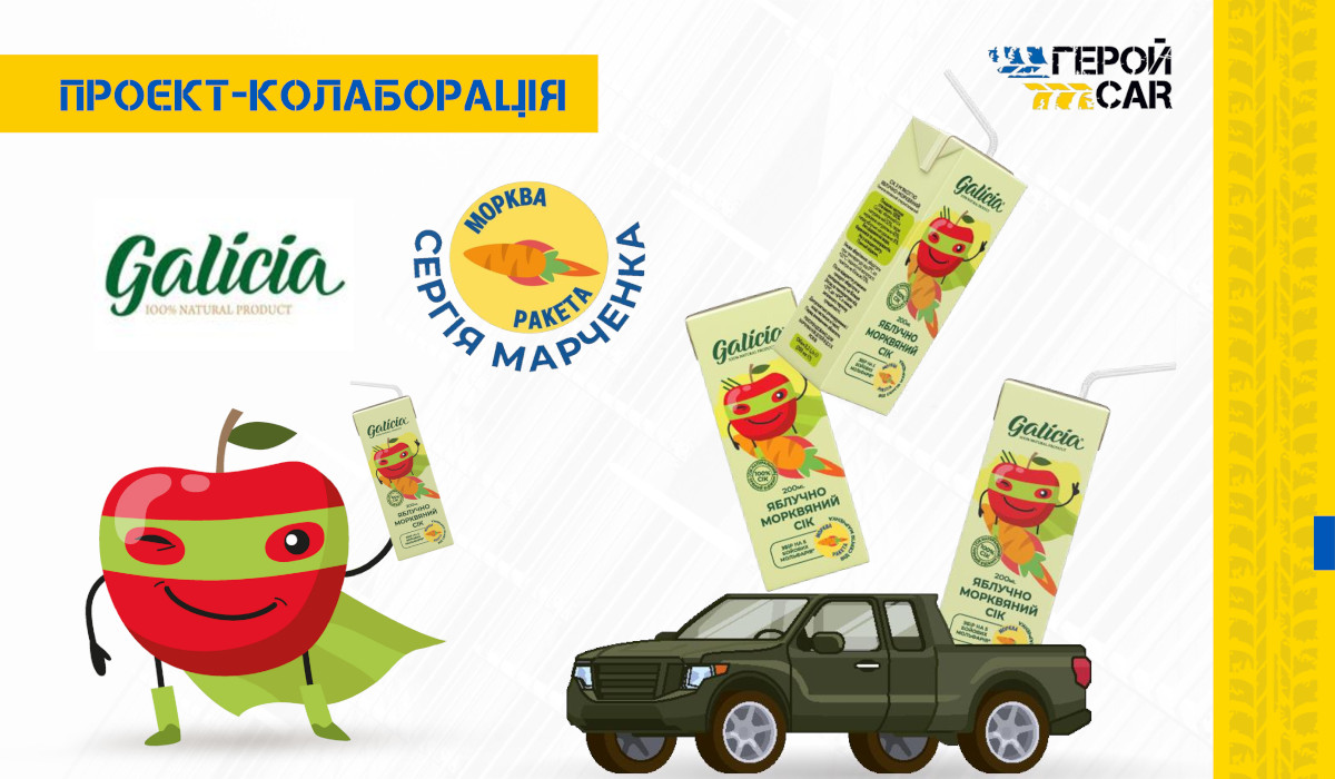 Маємо кейс з ТМ Galicia та рекрутером та блогером Сергієм Марченком. Разом з ними був створений маленький сік «Морква-ракета», кошти з реалізації якого перераховуються на закупівлю великих пікапів.