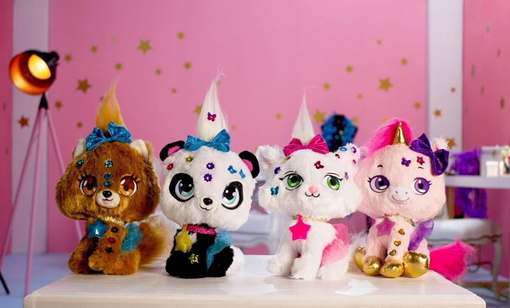 Shimmer Stars від KD Group – набори з симпатичними пухнастиками та яскравими блискітками, якими власниця зможе прикрасити свого улюбленця чи своє волосся. Цуцика, кошеня, пандочку та єдинорога можна вдягати та зав’язувати кокетливий бантик.