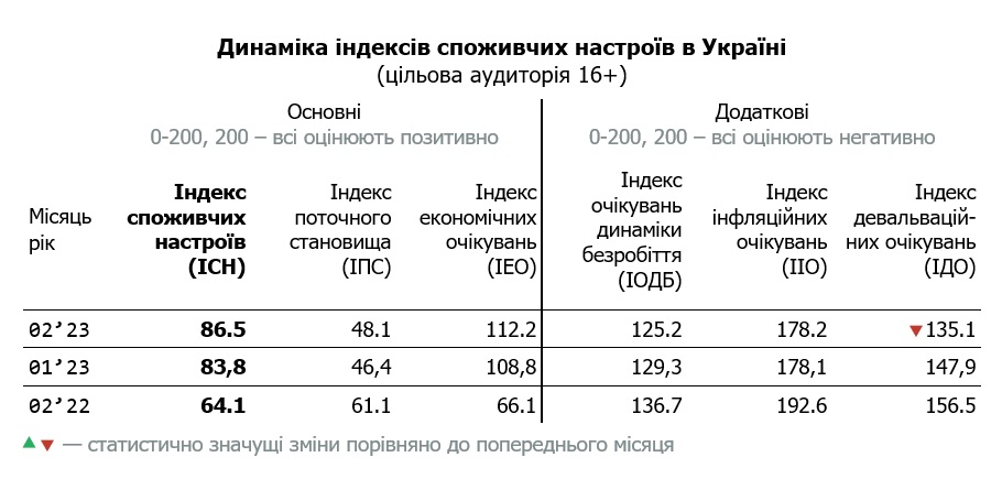 Як повідомляється на сайті компанії, у лютому 2023 року індекс споживчих настроїв (ІСН) склав 86,5 п., що на 2,7 п. вище за показник січня. Індекс поточного становища (ІПС) зріс і складає 48,1, що на 1,7 п. вище за рівень цього показника у січні. Складові цього індексу зазнали таких змін: