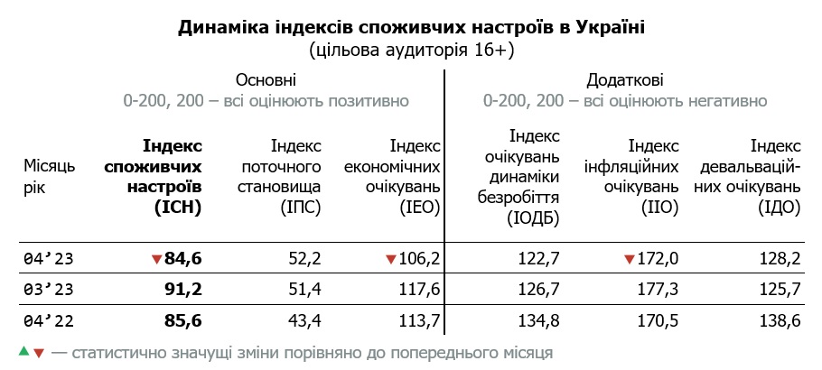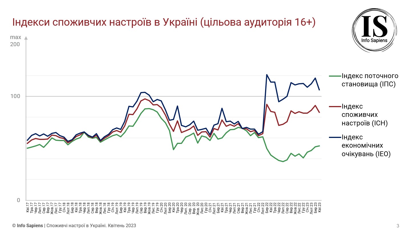 Як повідомляється на сайті Info Sapiens, у квітні 2023 року індекс споживчих настроїв (ІСН) склав 84,6 п., що на 6,6 п. нижче за показник березня. Індекс поточного становища (ІПС) зріс і складає 52,2, що на 0,8 п. вище за рівень цього показника у березні. Складові цього індексу зазнали таких змін:
