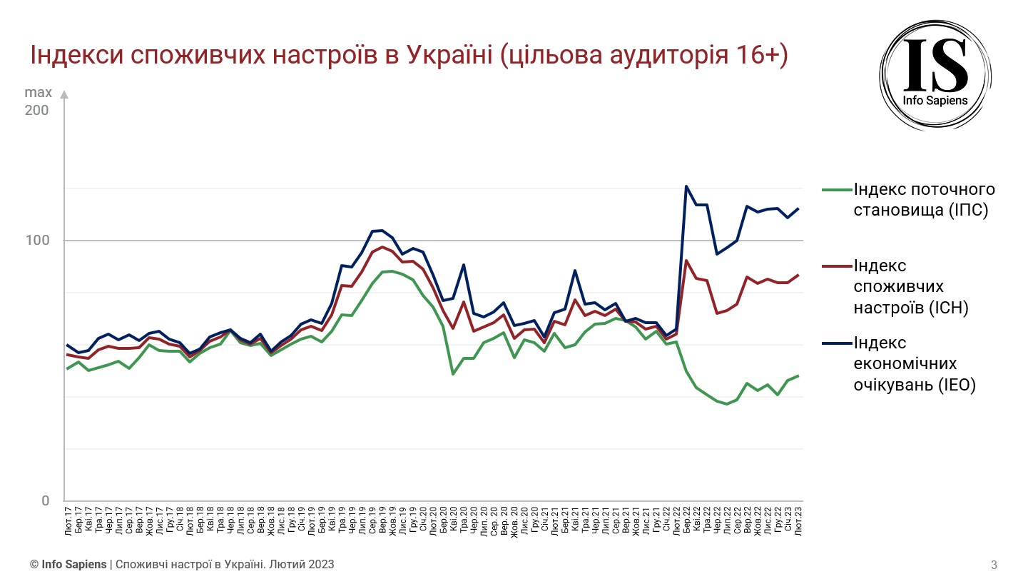 За даними дослідження Info Sapiens «Споживчі настрої в Україні», у лютому 2023 року індекс споживчих настроїв українців зріс на 2,7 пункти та становить 86,5 п. Зросли індекси доцільності робити великі закупи, очікуваних змін матеріального становища та очікуваного розвитку економіки впродовж найближчого року.
