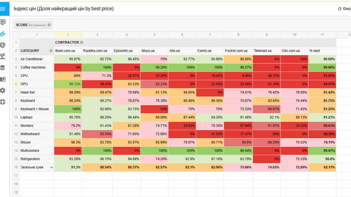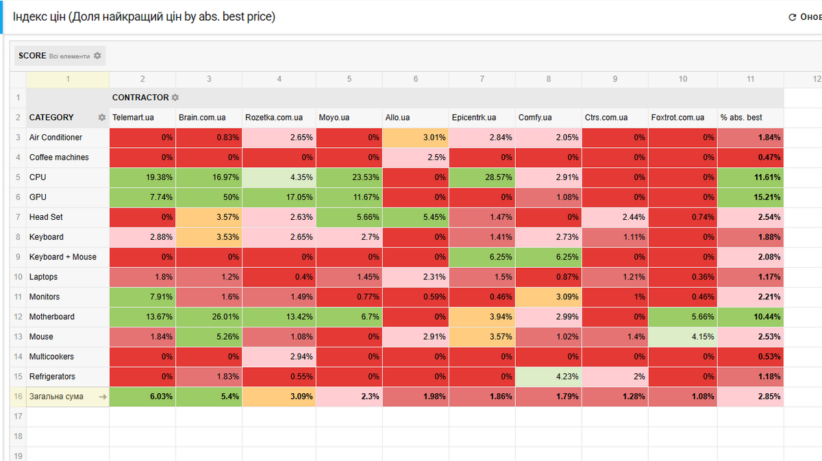 Наступний звіт показує, який відсоток найкращих цін на ринку має кожен магазин: