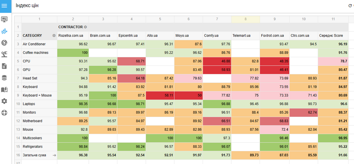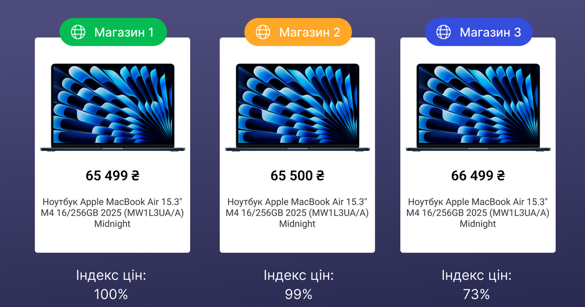 Індекс цін показує, наскільки привабливими для покупця є ціни магазинів-конкурентів. Найнижча ціна на ринку дає індекс 100%. Потім застосовується формула для кожної конкретної категорії товарів. Що далі ціна від найнижчої, то менший ціновий індекс.