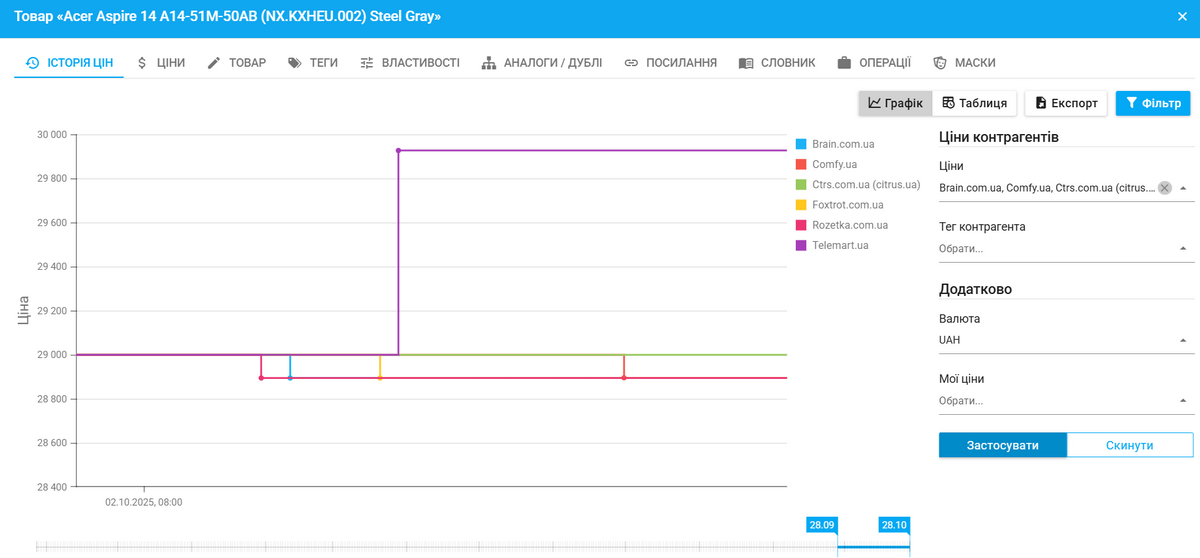 Відстежуючи, як конкуренти змінюють ціни на окремі SKU, ви бачите їхню тактику: чи стабільні вони, чи реагують на коливання цін на ринку, як швидко коригують позицію. Історія цін розкриває патерни поведінки.