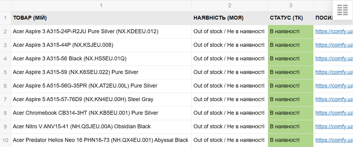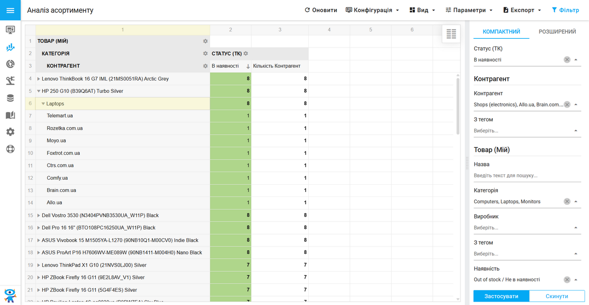Якщо багато товарів з вашого каталогу не в наявності, але в конкурентів вони доступні для купівлі, вам потрібно посилити роботу з асортиментом, щоб не віддавати конкурентам свої продажі. Нижче наведено приклад звіту Pricer24 «Аналіз асортименту», налаштованого за такими фільтрами: