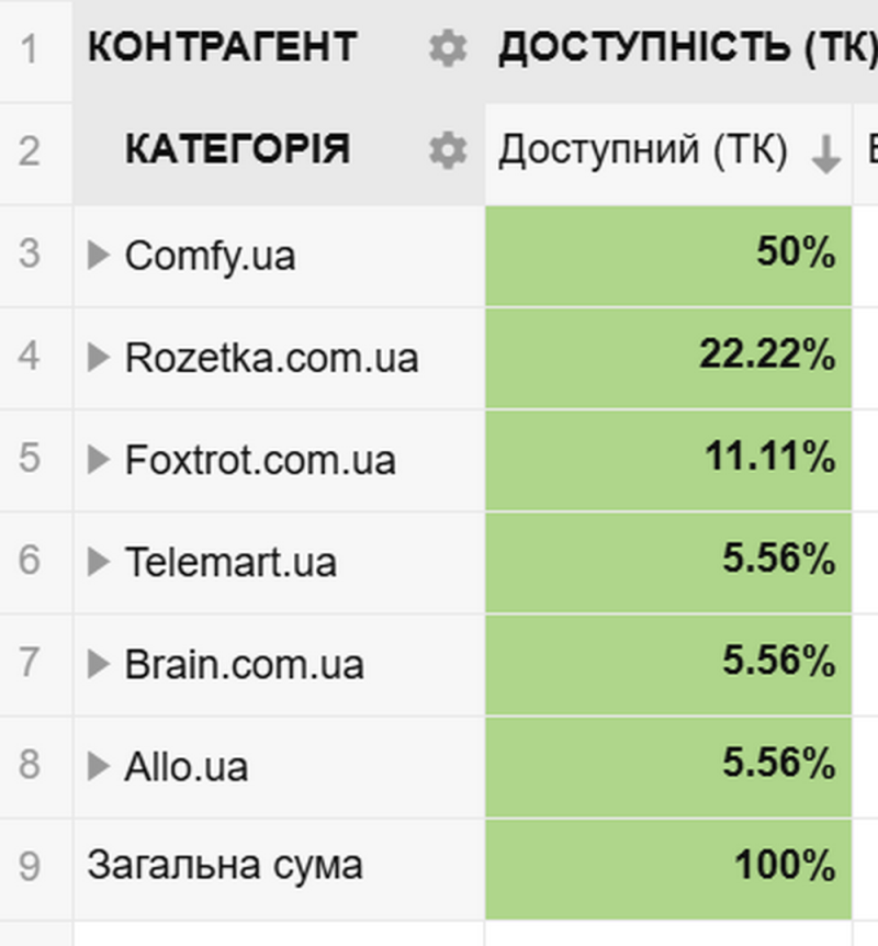 Цей показник відображає, скільки товарів, які загалом є у вашому каталозі, зараз у наявності в конкурентів і у вас.