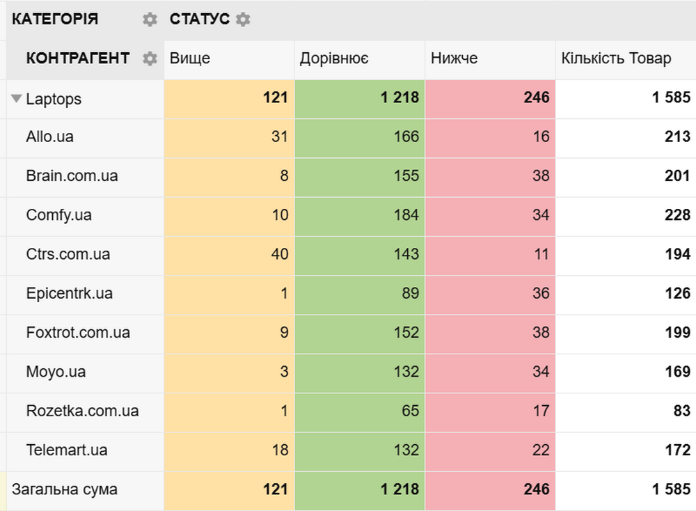 Цей показник відображає вашу конкурентну позицію в цифрах. Скільки позицій з вашого асортименту має найкращу ціну? Скільки цін такі самі, як у конкурентів? Скільки ваших цін вищі? Із цих даних починається аналіз вашої позиції відносно ринку.