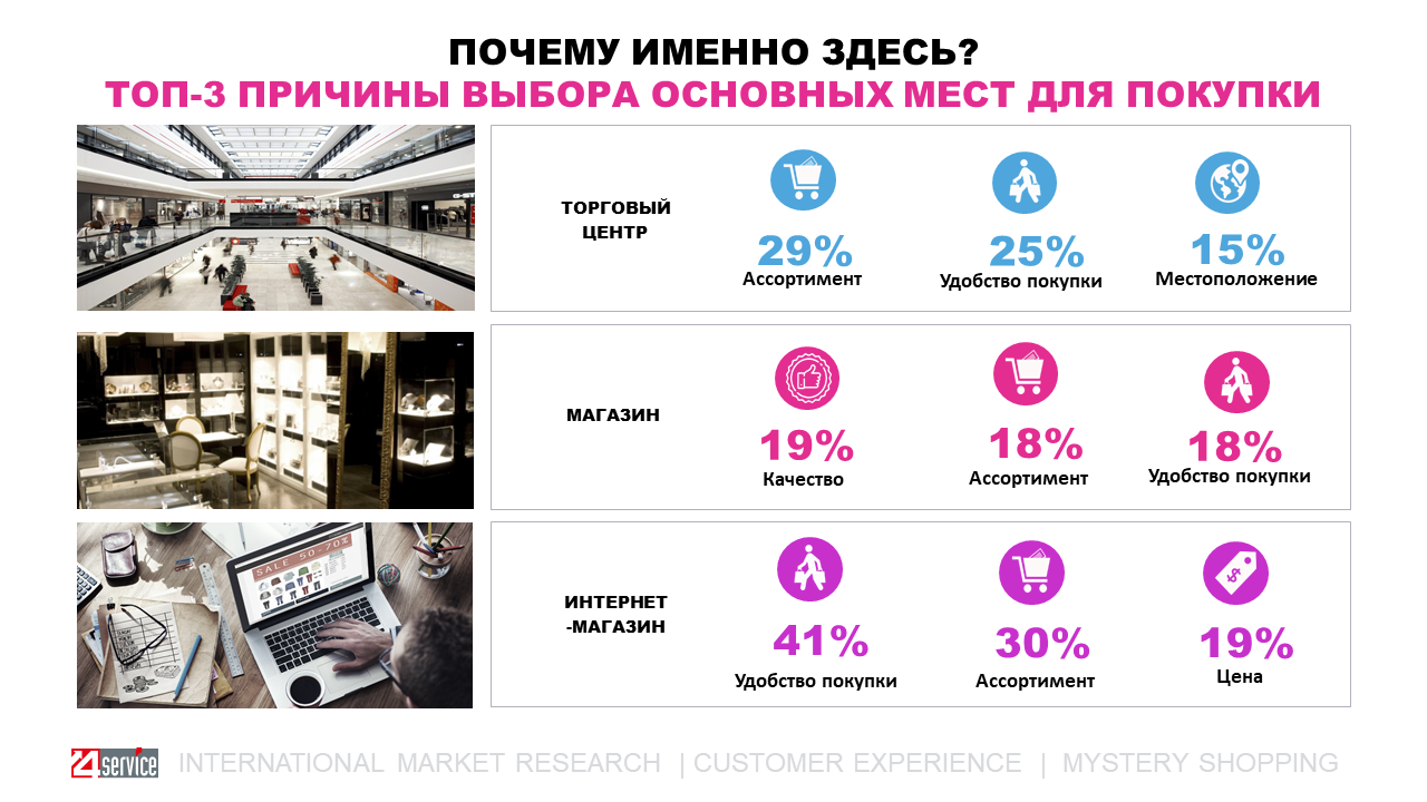 29% респондентів вибрали торгові центри внаслідок широкого вибору магазинів і товарів, 25% через зручності покупки і комплексного обслуговування, 15% орієнтувалися по місцю розташування.