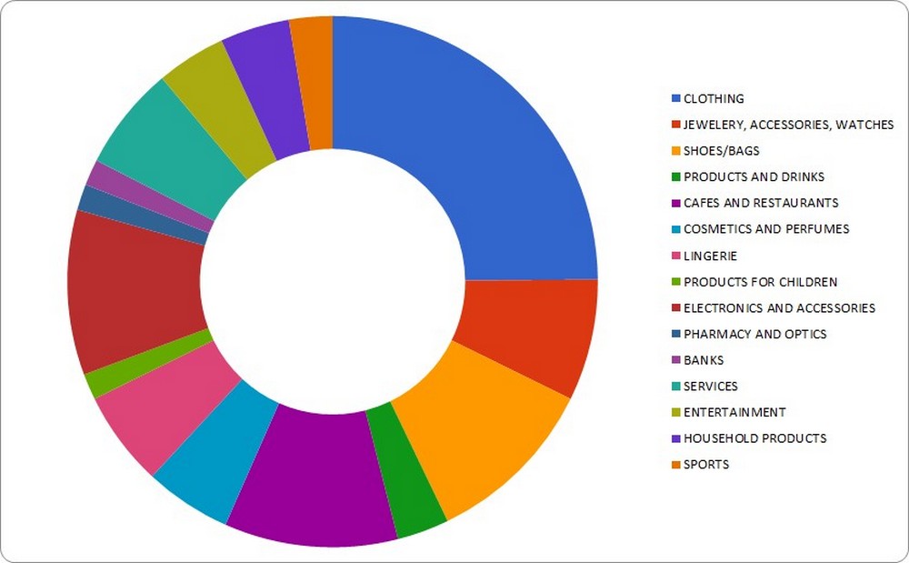 Стратегія, якої дотримується ТРЦ Рів’єра – пропонувати відвідувачам ексклюзивний і широкий вибір магазинів. Наприклад, близько 30 магазинів українських і міжнародних брендів представлені в Одесі тільки в ТРЦ Рів’єра. При цьому керуюча компанія продовжує постійно працювати над поліпшенням tenant-mix і залученням нових національних і зарубіжних операторів. За останні півтора року в комплексі почали роботу магазини таких відомих брендів, як Miraton, New Balance, SuperDry, DeFacto, Pierre Cardin, Crocs, Шик і Блиск, Baby Бум, Privado, Bags etc., Vivat, Сирне королівство, Ijevan, Respect, F91, OLLA, ЖЖУК.