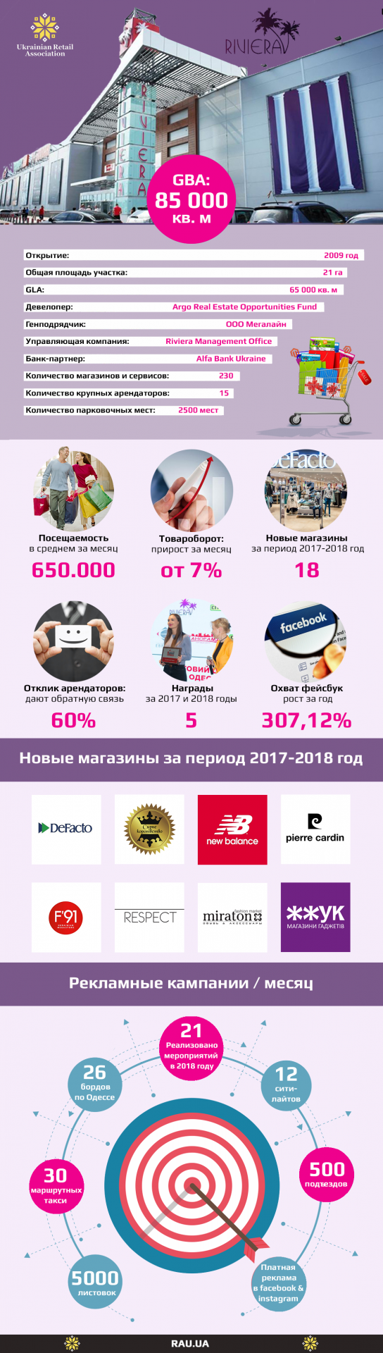 Довідка. Загальна площа ТРЦ Рів’єра становить 85 000 кв. м, орендна – 65 000 кв. м. Комплекс відкритий в 2009 році. На даний момент в ТРЦ працює 230 магазинів і сервісних служб, в тому числі 15 якірних орендарів. Крім магазинів, в комплексі знаходиться боулінг на 16 доріжок, 9-зальний кінотеатр, розважальний центр для дітей, фуд-корт. Поруч розташована парковка на 2500 машиномісць і найбільший в Одесі картинг.