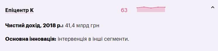 Друге місце в рейтингу з середнім балом 63 посіла мережа торговельних центрів Епіцентр. Найбільшу оцінку компанія отримала в категорії «Інноваційність бізнес-процесів» – 69 балів, а найменшу – 55 балів – за «Інноваційність бізнес-моделі».