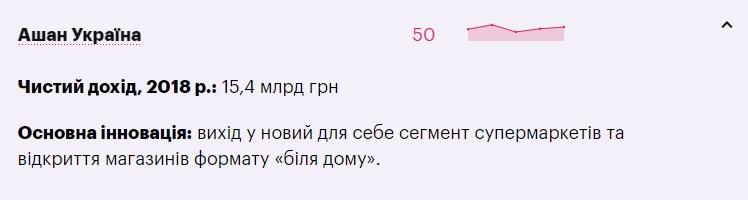 Французька мережа Ашан, незважаючи на впровадження нових торгових форматів та активний розвиток e-commerce в останні роки, була не високо оцінена експертами. Найбільшу оцінку вона отримала в категорії «Інноваційність бізнес-процесів» – 65 балів. Найменшу (36 балів) – за «Інноваційність бізнес-моделі».