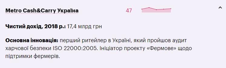 Інший міжнародний рітейлер, представлений в Україні – Metro Cash&Carry – був найгірше оцінений експертами. При цьому, як і Ашан, мережа Metro також отримала найвищу оцінку за категорію «Інноваційність бізнес-процесів» (64 бали), а найменшу (38 балів) – за «Інноваційність бізнес-моделі».