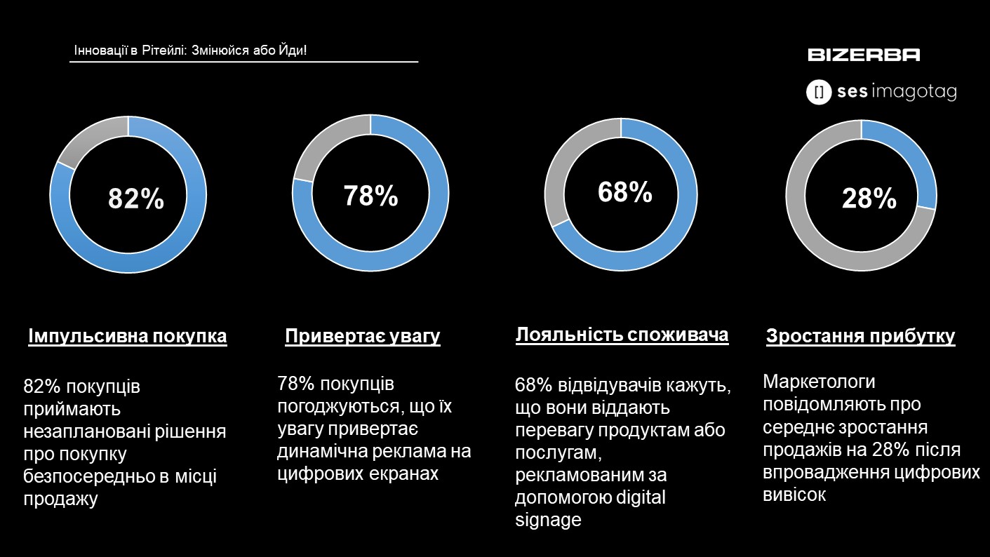 Як показують дослідження компанії SES-imagotag, що спеціалізується на системах електронного маркування полиць і роздрібній торгівлі, приблизно 82% відвідувачів магазину приймають рішення щось купити прямо на місці. 78% погоджуються, що їх увагу привертає реклама на цифрових екранах. 68% визнають, що приймають рішення придбати товари або послуги, які рекламуються на Digital Signage (технологія подання інформації на електронних носіях). Відзначається, що після впровадження цифрових вивісок продажі зросли на 28%.
