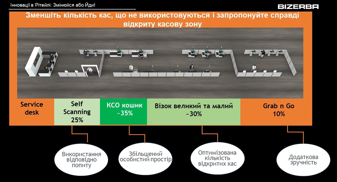Тепер на додачу до звичайних кас самообслуговування можуть додаватися зони для тих, хто вже просканував товар у залі і тепер тільки повинен розплатитися, в тому числі зона для великих візків з товаром.