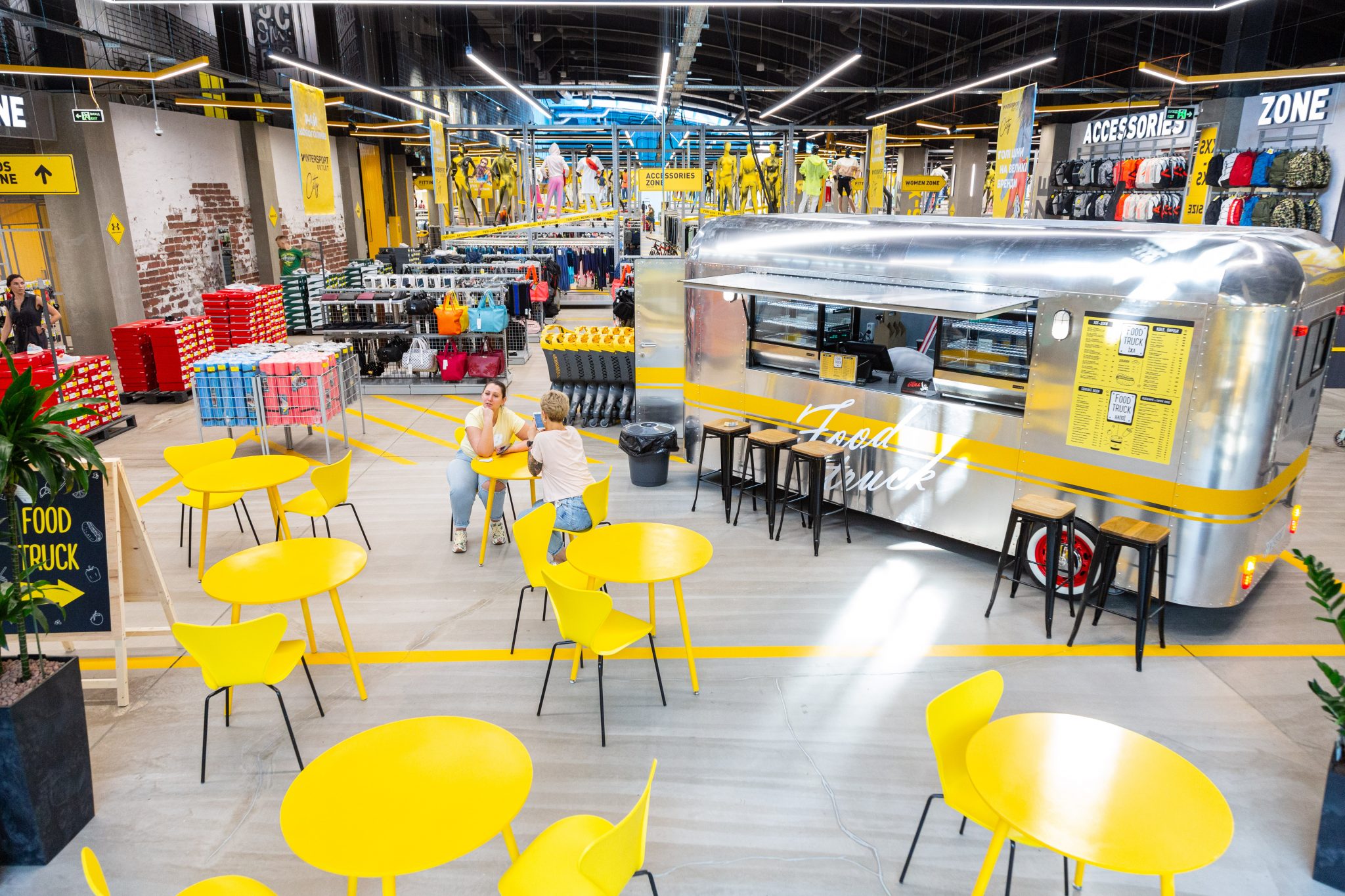 При вході у магазин розташоване кафе, де можна відпочити, випити кави та перекусити під час шопінгу. Кафе являє собою фуд-трак з їжею як з американських фільмів. В асортименті широкий вибір напоїв та хот-догів, представлені й веганські.