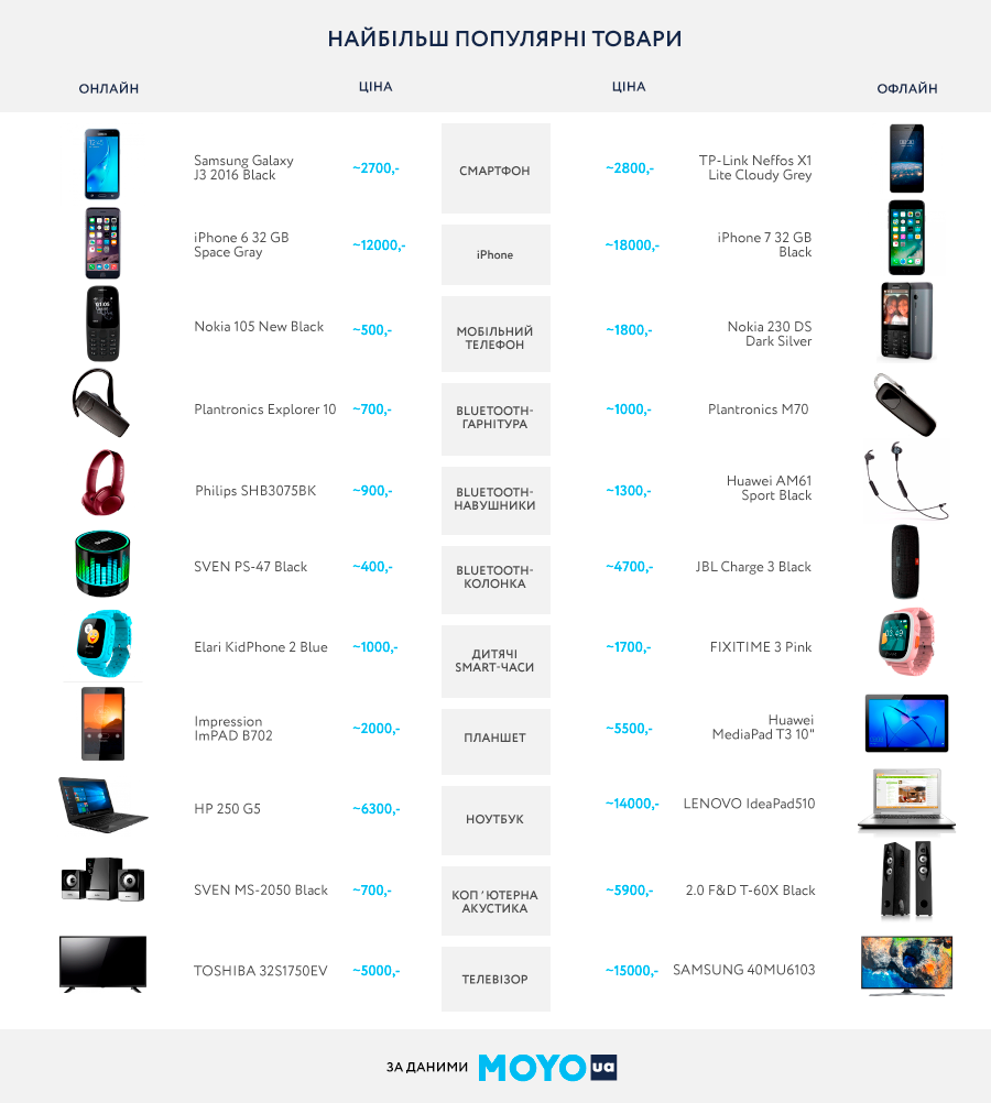 Аналогічна ситуація з телевізорами — в онлайні високий попит на TOSHIBA 32S1750EV з цінником в 5 000 грн, тоді як в роздрібних магазинах вважають за краще купувати SAMSUNG 40MU6103 за 15 000 грн. Найпопулярніший телефон на сайті moyo.ua — Nokia 105 New, вартість якого всього 500 грн, тоді як в роздрібних магазинах мережі найбільш затребувана модель Nokia 230 за 1 800.