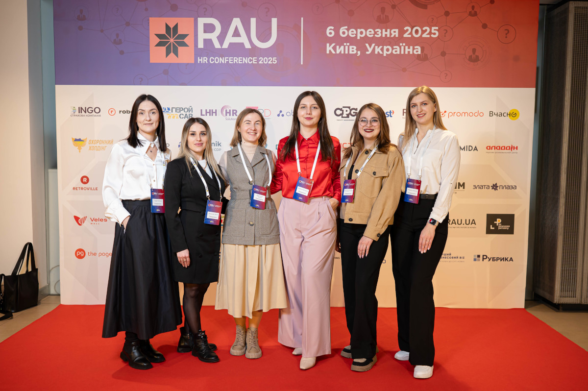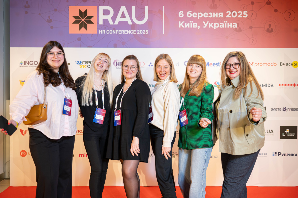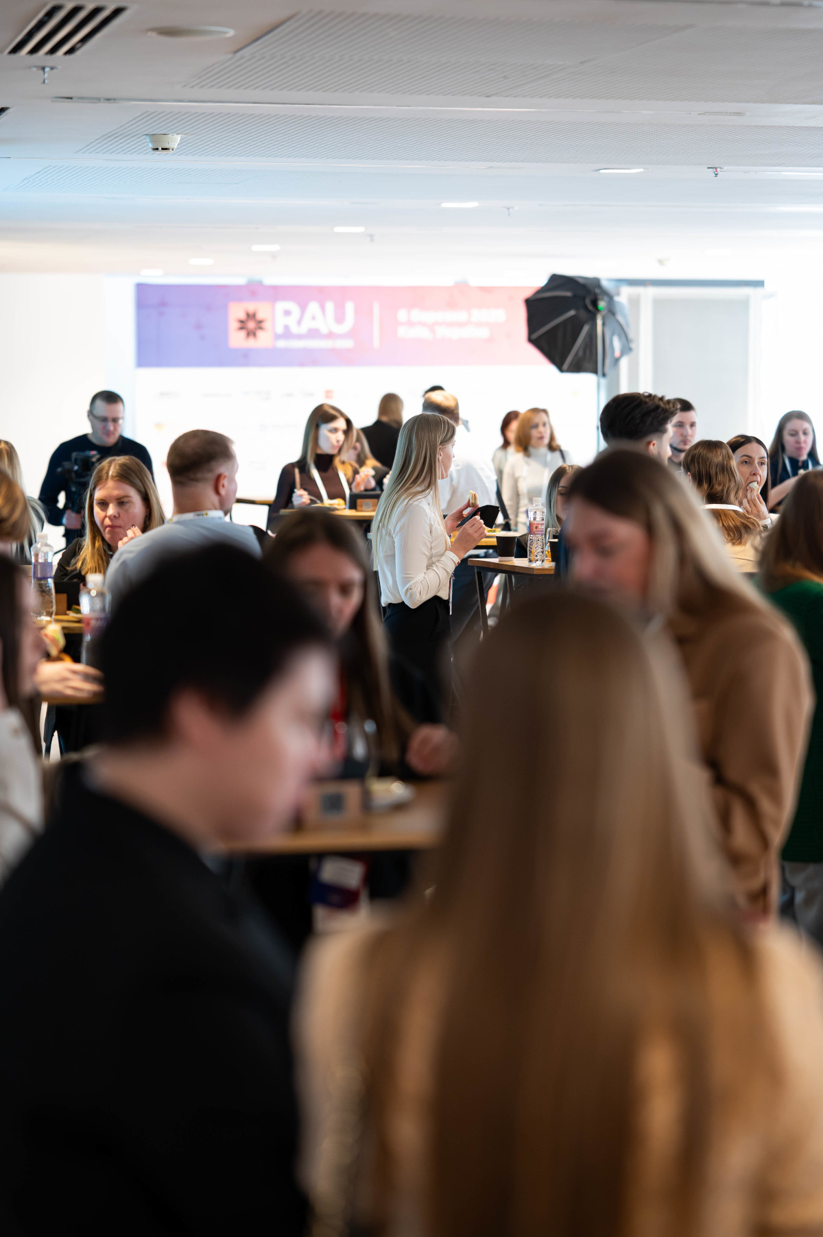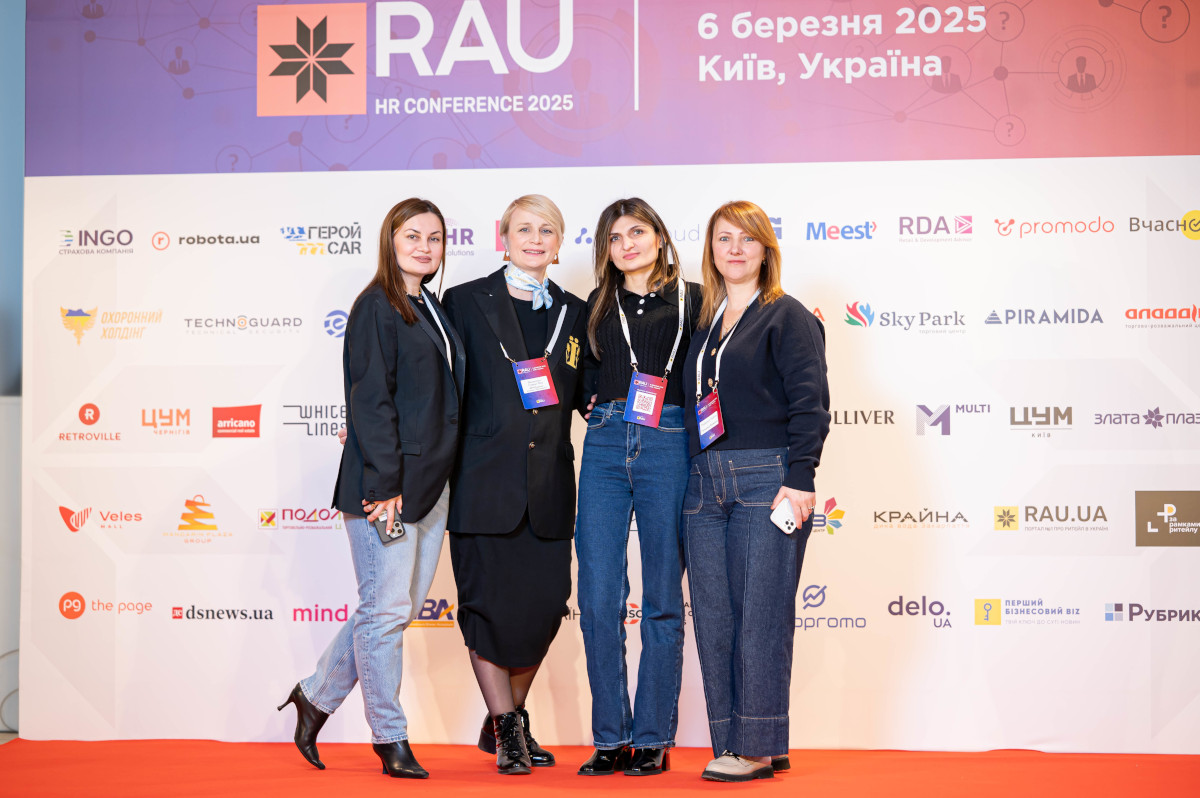 Ще до початку заходу гості активно спілкувалися та фотографувалися біля бренд-вола події з логотипами партнерів і спонсорів RAU HR Conference.