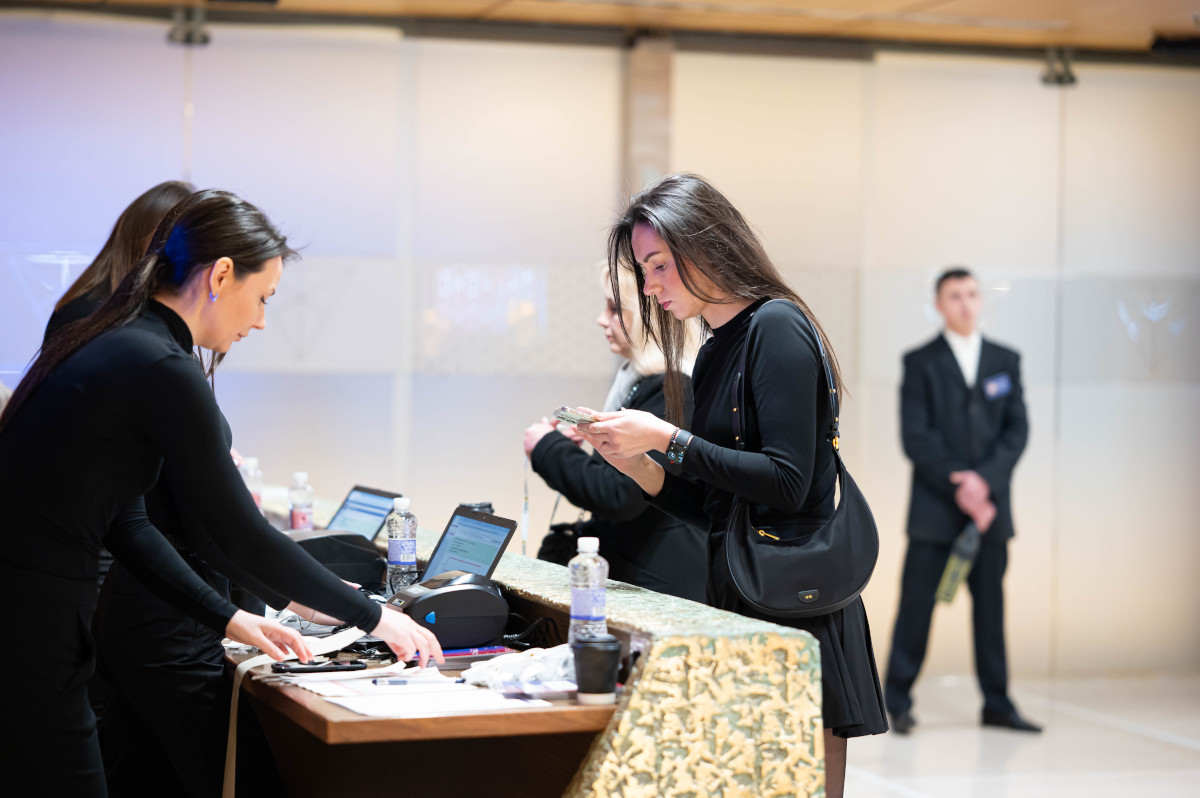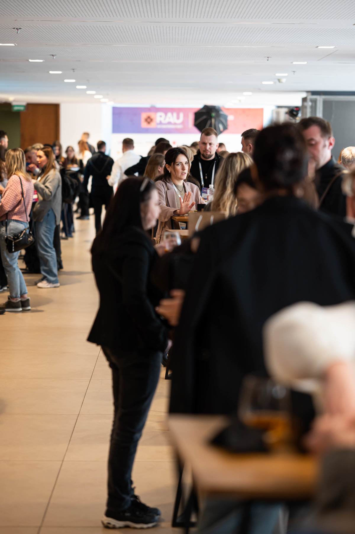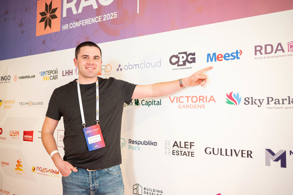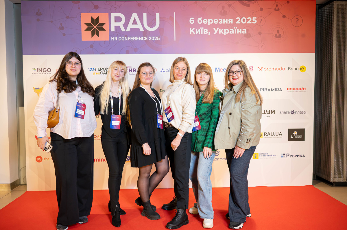 Ще до початку заходу гості активно спілкувалися та фотографувалися біля бренд-вола події з логотипами партнерів і спонсорів RAU HR Conference.