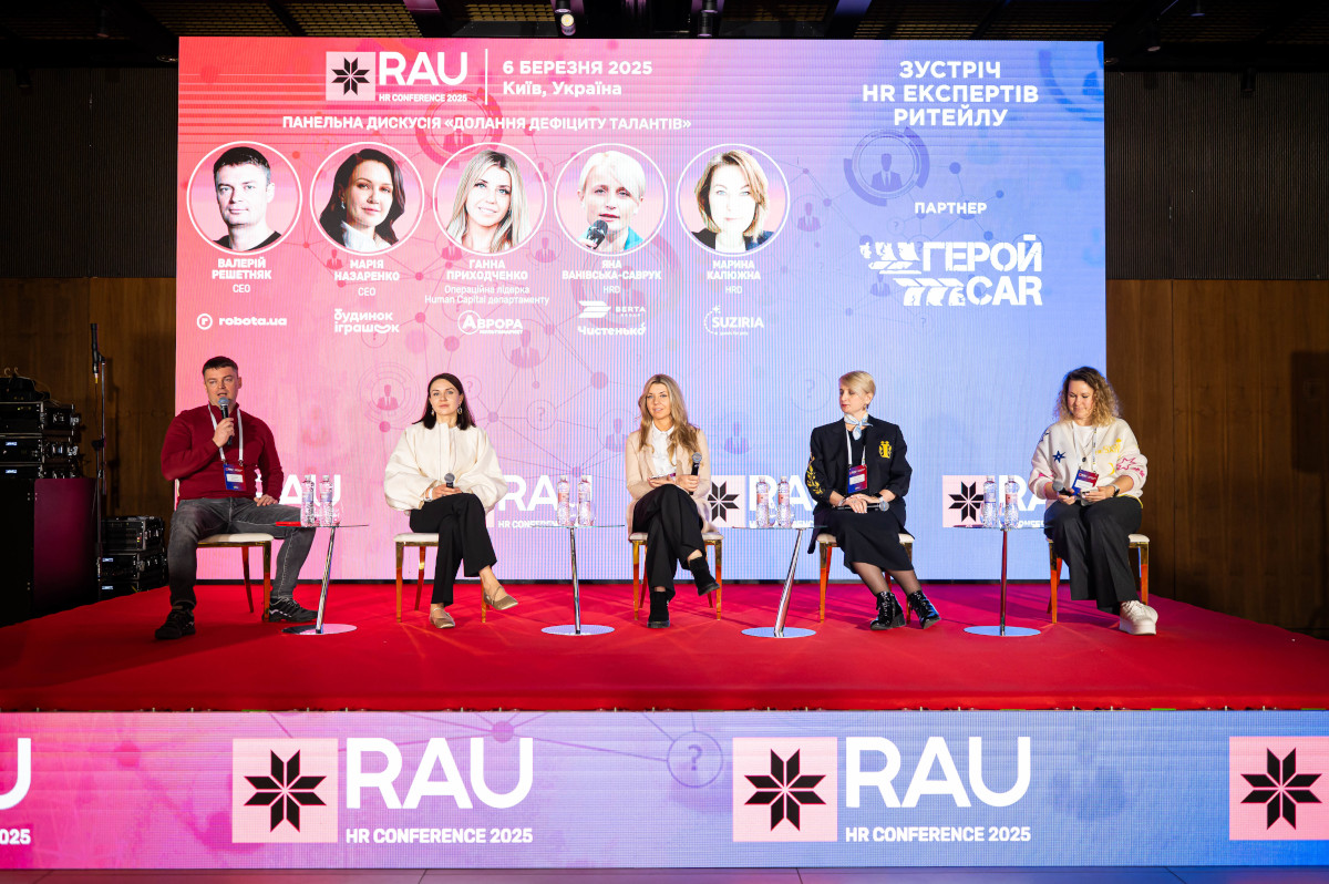 Марія Назаренко, СЕО Будинок іграшок, Ганна Приходченко, операційна лідерка Human Capital департаменту мережі мультимаркетів Аврора, Яна Ванівська-Саврук, HRD BERTA group мережа Чистенько, Марина Калюжна, HRD Suziria Group та Валерій Решетняк, СЕО Robota.ua, в рамках панельної дискусії обговорили, як долати дефіцит кадрів.