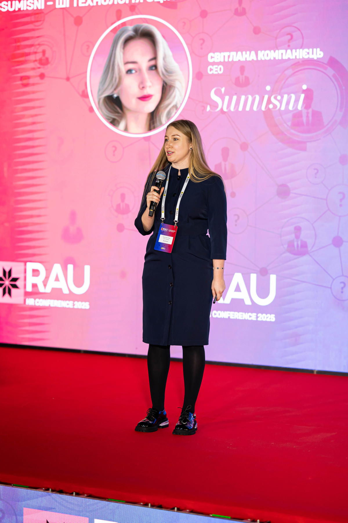 Світлана Компанієць, СЕО Sumisni, виступила з темою «Sumisni – ШІ технологія оцінки особистісних якостей людини». Вона розповіла, що наймати людей інтуїтивно – це велика помилка, яка може коштувати дуже дорого бізнесу. А поліграфи, тестові завдання, тести та інтуїція – це ілюзія обману. Тому розробили ШІ-технологію для оцінки особистісних якостей людини – Sumisni.