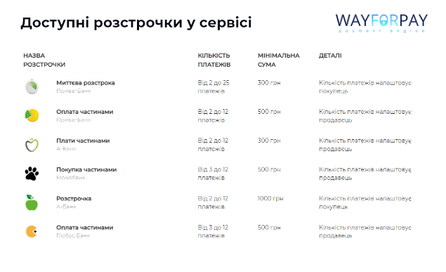 У сервісі WayForPay доступні 6 видів онлайн-розстрочок, від чотирьох українських банків: