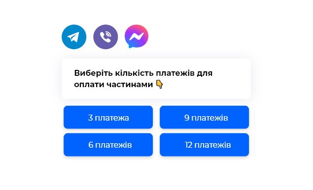 Продавець може оформити продаж товару в розстрочку в пару кліків через Viber, Telegram, Facebook Messenger. При цьому, для продавця не потрібен термінал, а також не потрібно укладати договір з кожним з банків.
