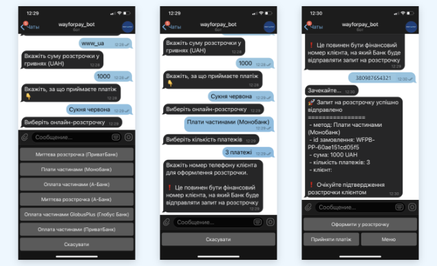 Для оформлення товару в розстрочку досить бути підключеним до сервісу WayForPay і авторизованим в боті WayForPay_Bot. Продавець в боті вказує вид розстрочки, суму, кількість платежів і телефон клієнта. При цьому клієнту достатньо буде тільки підтвердити розстрочку в додатку свого банку.