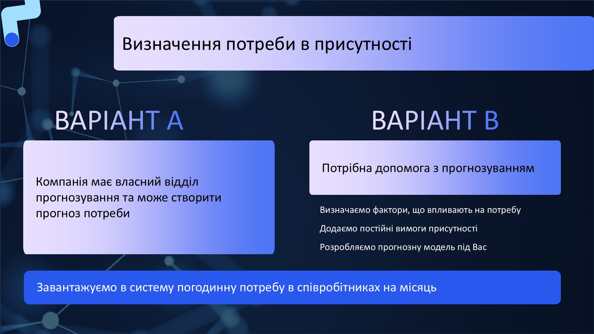 1. Визначення необхідної присутності персоналу за рахунок мінімальної кількості працівників, які необхідні на кожен момент часу для того, щоб забезпечити операційну діяльність певної точки. Тут є два варіанти. Якщо в певній компанії є відділ, який може спрогнозувати та створити прогноз потреби – приймаємо їх у систему. Якщо такого відділу немає і потрібна допомога з прогнозуванням, тоді визначаємо фактори, що впливають на потребу, додаємо постійні вимоги присутності та розробляємо прогнозну модель під певний бізнес.