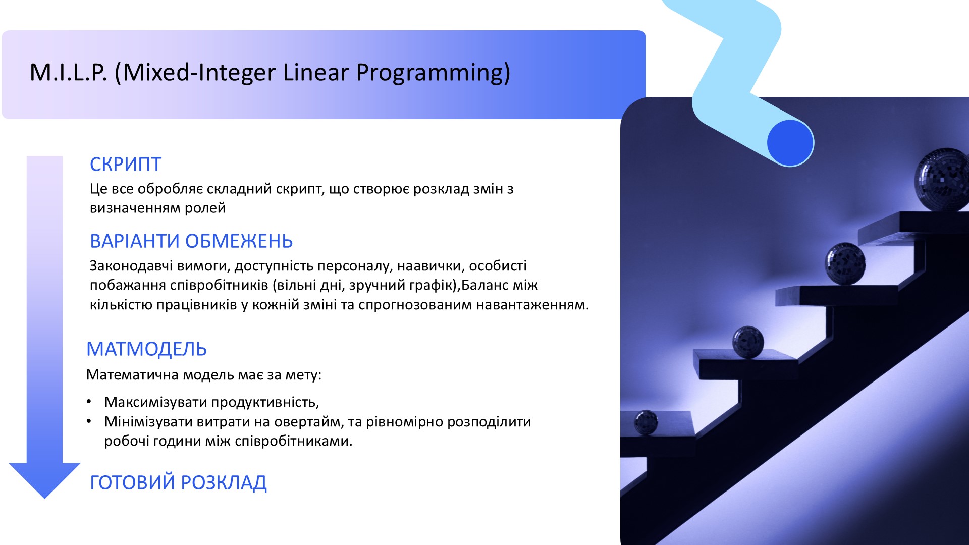 Система працює на базі математичної логіки та технологій M.I.L.P., завдяки чому графіки формуються автоматично, забезпечуючи баланс між інтересами бізнесу та працівників.