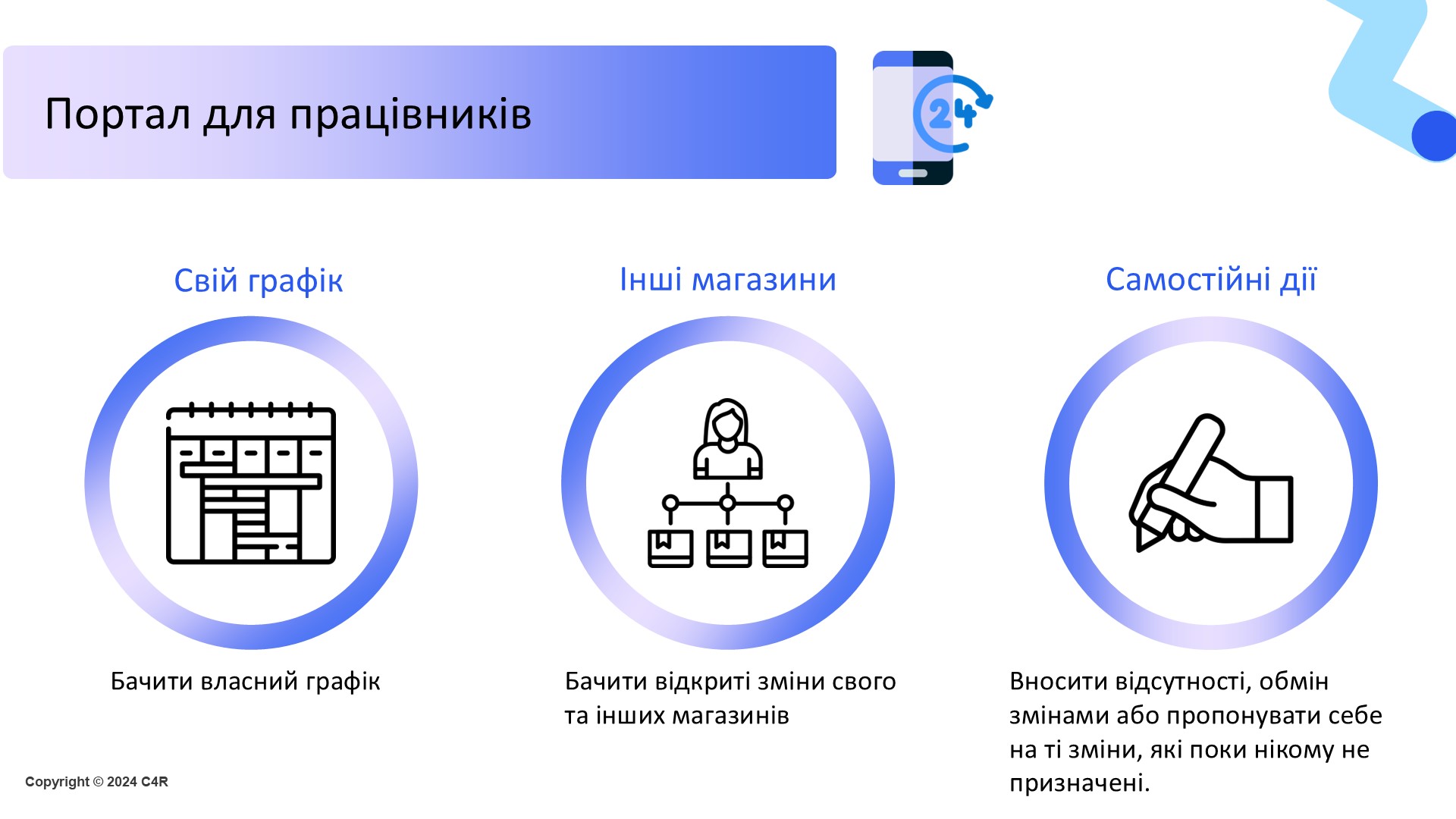 3. І третя частина – портал працівників, де кожен може подивитися свій власний розклад, відкрити зміни всього магазину та інших точок та вносити відсутності, обмін змінами або пропонувати себе на ті зміни, які поки нікому не призначені.