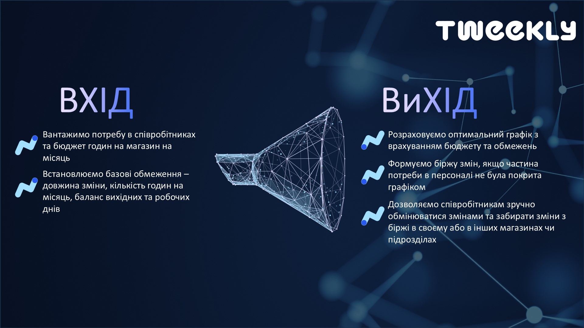 Tweekly дозволяє компаніям бути по-справжньому гнучкими в роботі зі співробітниками. У працівників є можливість створювати графіки з урахуванням своїх потреб та потреб роздрібних точок, обмінюватися змінами між магазинами і при цьому правильно розподіляти бюджет, витрачений на фонд оплати праці, між магазинами контролювати обмін змінами та наймати співробітників з різними компетенціями та розставляти зміни відповідно до навичок та дозволів для роботи.