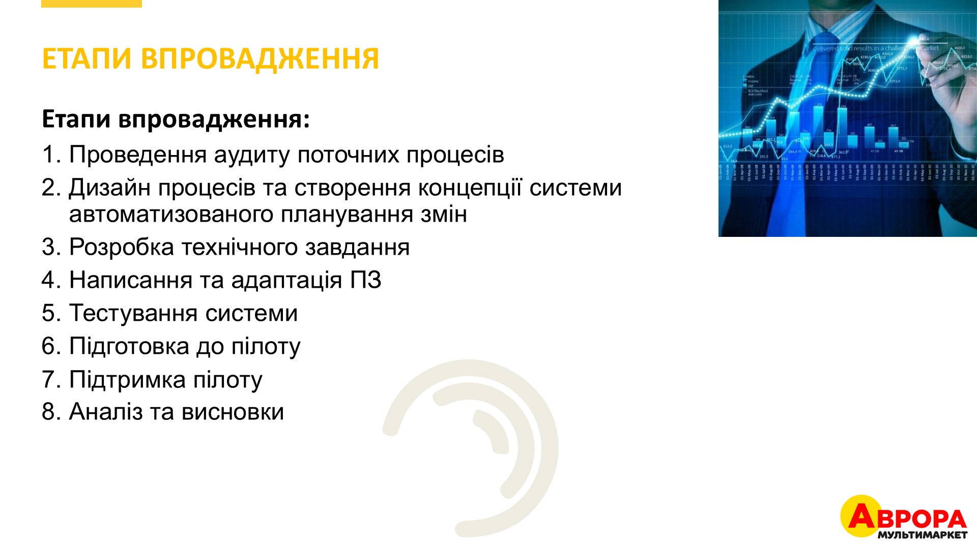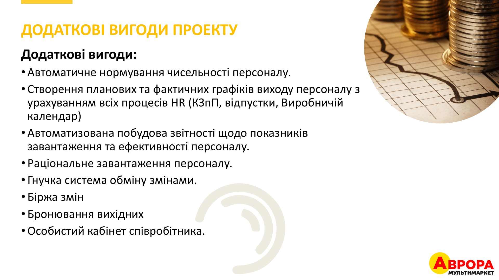 При цьому хотіли отримати додаткові вигоди: зменшення часу на формування графіків та їх затвердження, зняття піків навантаження в торгових точках, автоматизувати системи табелювання та автоматизувати виконання КЗпП (погодинна оплата потребує додаткових моментів, які має врахувати система).