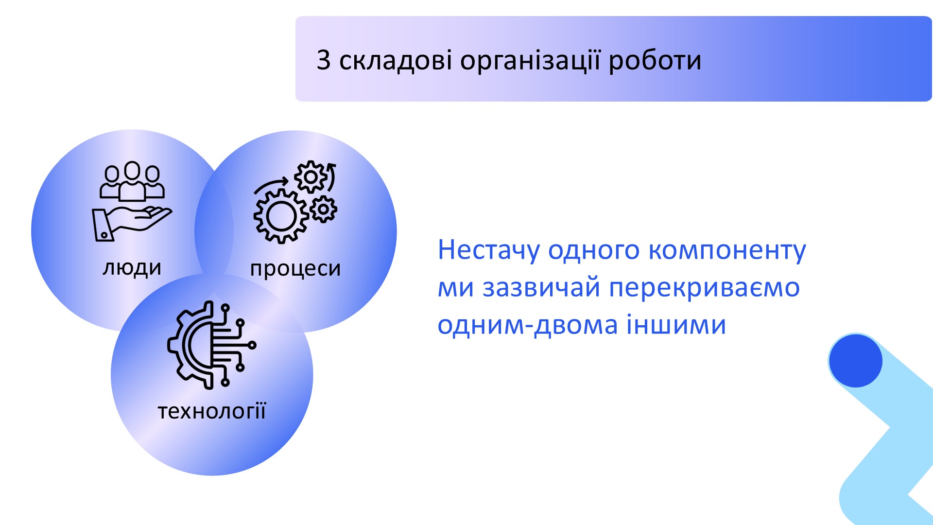 Три складові організації роботи компанії – люди, процеси та технології. Нестачу одного компоненту ми зазвичай перекриваємо одним-двома іншими.