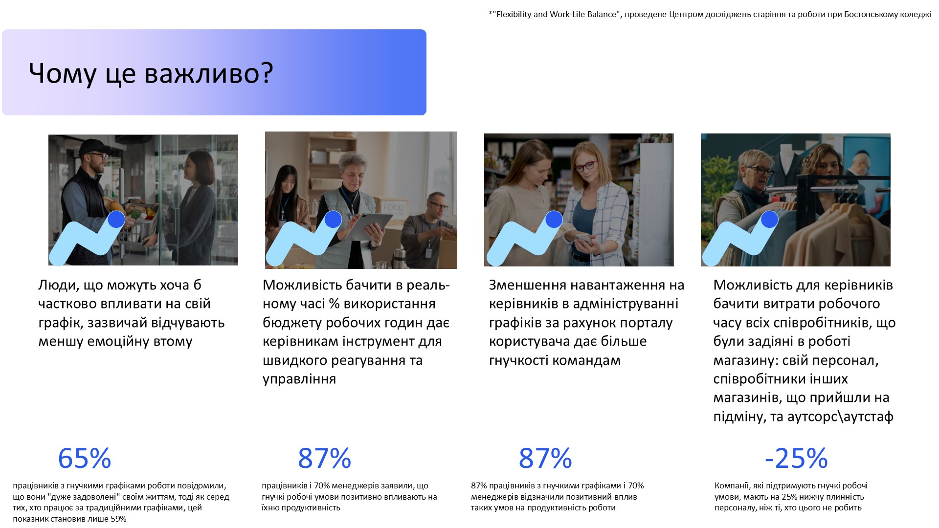 До того ж 87% працівників і 70% менеджерів заявили, що гнучкі робочі умови позитивно впливають на їхню продуктивність. Це можливість бачити в реальному часі відсоток використання бюджету робочих годин, що допомагає керівникам швидко реагувати.