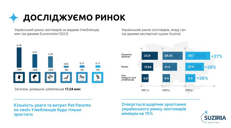 За даними експертної оцінки групи компаній Suziria Group, у 2023 році зооринок зріс на 27% у гривневому еквіваленті порівняно з 2022 роком. Прогноз на 2024 рік свідчить про мінімальний ріст — на 15%.