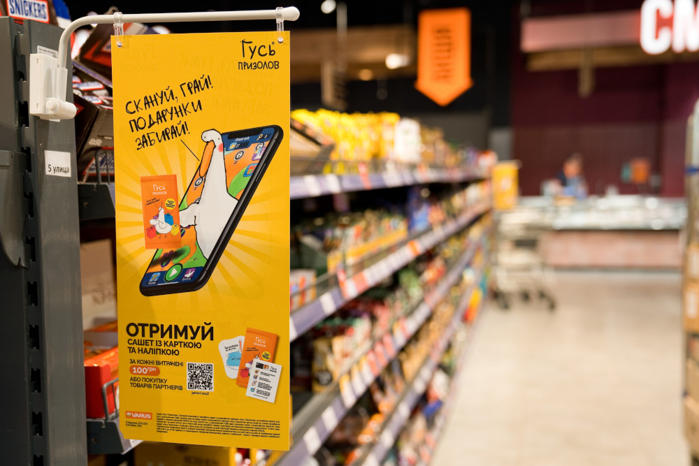 Перше й ключове, що зіграло свою роль – у грі “Гусь Призолов” дуже проста, але затягуюча механіка. Правила такі: купуєш товар на 100 грн або товари з виділеними цінниками в мережі магазинів-партнерів – отримуєш за це сашет з наліпкою та карткою з унікальним QR-кодом. Граєш в мобільну гру. Допомагаєш персонажу зібрати подарунки та отримуєш за це призи, які можна відкрити, відсканувавши QR-код. В цих ігрових подарунках, окрім бонусних балів рейтингу, заховано 1 млн сертифікатів від партнерів. А топ-100 гравців отримують ще й цінні подарунки.