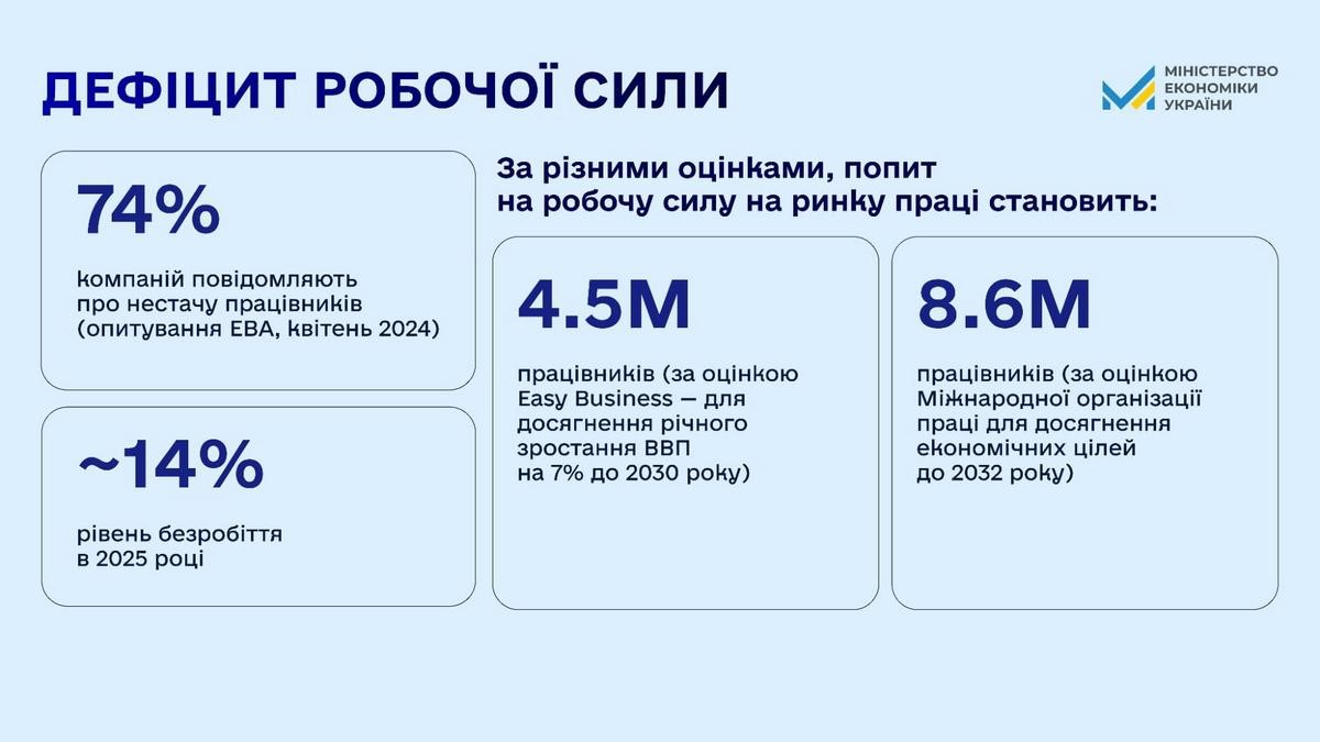 За словами заступниці міністра економіки України Тетяни Бережної, яка виступила з онлайн-підключення до RAU HR Conference, ринок праці України зазнає значних викликів, передусім через триваючу війну, економічну нестабільність, міграційні процеси та зміну потреб населення. У 2024 році рівень безробіття становив 14,2%. За прогнозами у 2026 році він знизиться до 10,6%. Потреба у працівниках до 2030 року становитиме 4,5 млн осіб (за розрахунками Міністерства економіки для щорічного зростання ВВП на 7%).