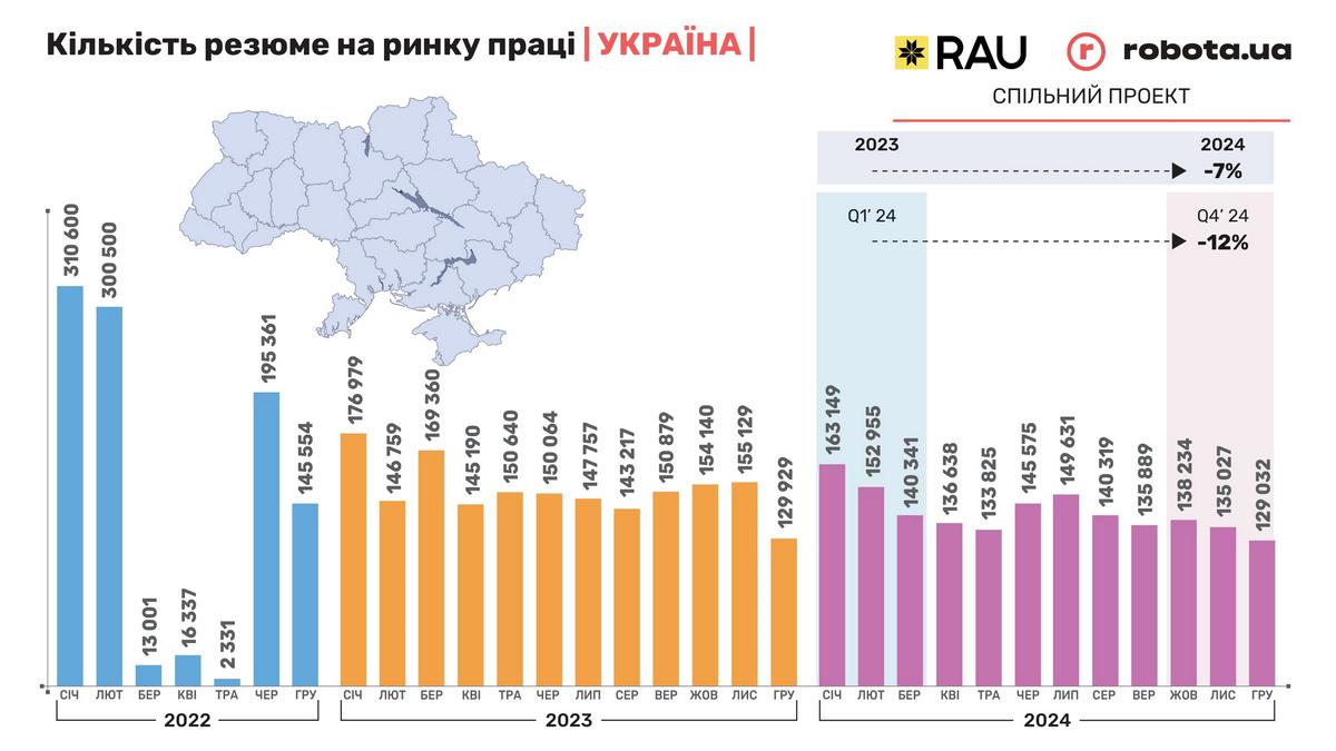 Також попри те, що експерти robota.ua відмічають зростання кількості вакансій на 4% у 2024 році від довоєнного рівня, кількість кандидатів, готових їх зайняти, зменшується.