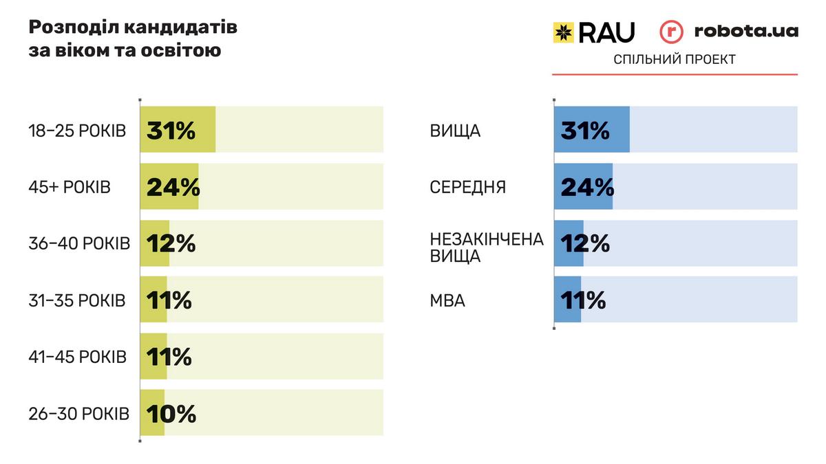 Наразі третина кандидатів, які шукають роботу – це молоді люди віком від 18 до 25 років, тобто ті, хто лише починає свій трудовий шлях. Близько чверті складають представники старшого покоління від 45 років, які вже давно стали професіоналами у своїй сфері.