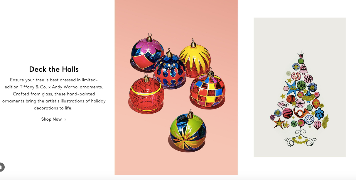 На мій погляд, кейс високого маркетингу від Tiffany. Різдвяна кампанія будується на продукті – це спеціальна авторська колекція подарункових карток, різдвяних прикрас і аксесуарів для дому, розроблених з 1957 по 1962 на основі ілюстрацій Енді Ворхола.