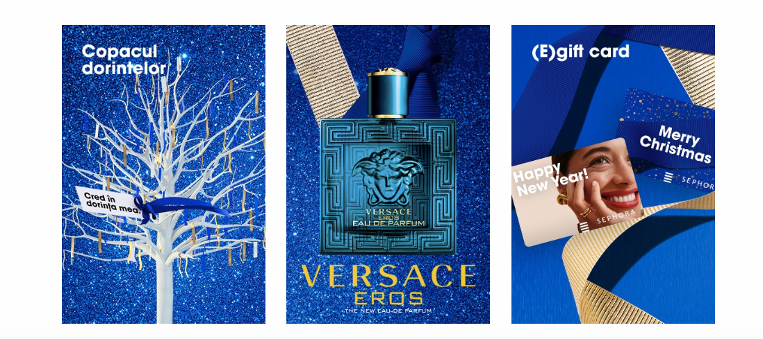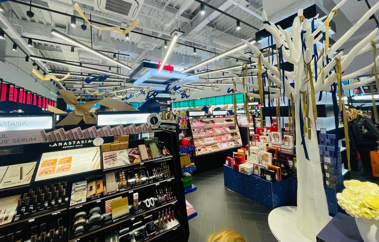 Мені сподобалася концепція комплексного оформлення Sephora, яка будується на візуальній ідеї різдвяної кампанії. Її центральним елементом стала стрічка, якою зав’язують пакування подарунка. Ця стрічка як символ-ассоціація, присутня як в зовнішній, так і внутрішній in-store комунікації, на упаковці подарункових наборів, як нарядний декор підвішена по всьому залу магазину, нею вбрана стилізована ялинка, и також вона присутня на оформленні зони входу. А сама зона входу виглядає як пакування подарунку – нічого складного з технічної точки зору, але ж як додає святковості.