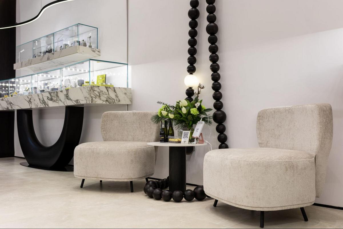 В бутику створили зону відпочинку для відвідувачів з декоративним елементом у вигляді чорного намиста, що звисає зі стелі. Цей арт-об’єкт не лише виконує декоративну функцію, а й створює асоціації з українськими традиціями. Тут клієнти завжди можуть випити кави, або відсвяткувати покупку келихом холодного ігристого.