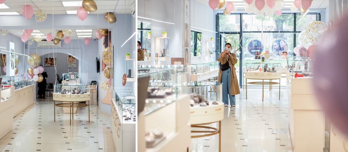 Інтер’єр магазину виконаний з елегантними меблями та м’яким світлом, що створює ідеальні умови для ювелірного шопінгу. Також встановлена ультразвукова машинка для чистки ювелірних прикрас, що дозволить за лічені хвилини очистити ваші вироби. До того ж, можна випити чашку кави в окремій кімнаті для відпочинку, доки консультанти упаковують ваші прикраси.