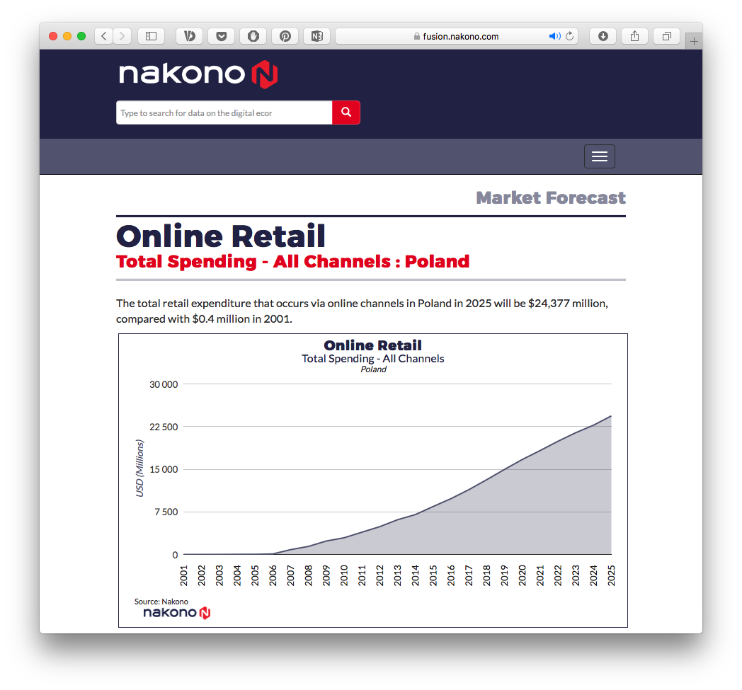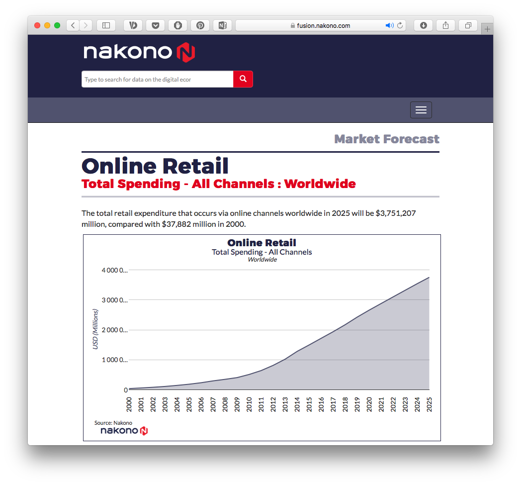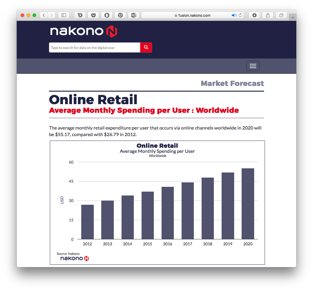 Ці прогнози визначають, скільки грошей споживачі будуть витрачати в інтернеті до 2025 року. Як повідомляють аналітики платформи Nakono, середньомісячний рівень витрат розраховується шляхом ділення загальних роздрібних витрат на певний рік на середню кількість активних користувачів інтернету за цей рік. Зокрема, враховано, що транзакції для бізнесу (B2B) є частиною більш широкого ринку електронної комерції, але не частиною онлайн-торгівлі в роздріб.