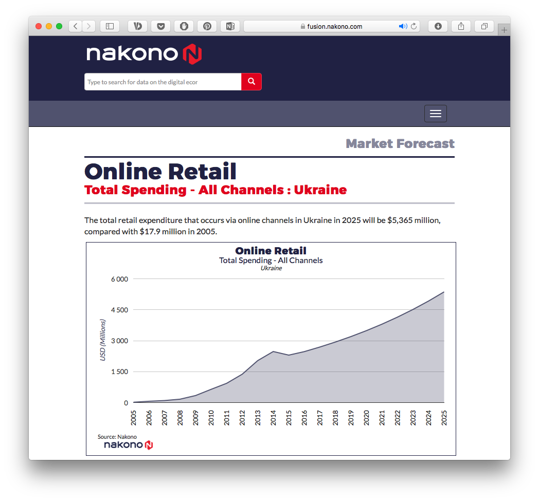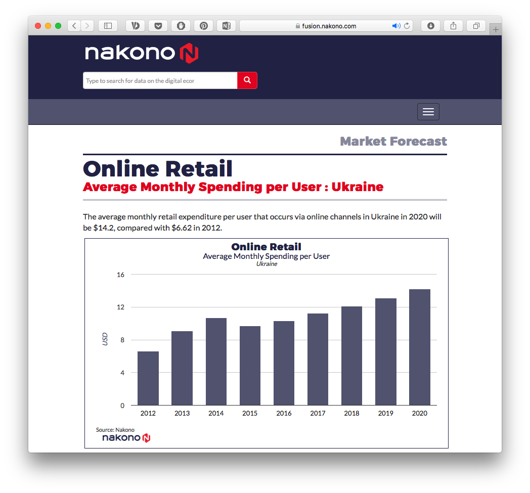 Середні витрати на місяць на користувача в українських інтернет-магазинах до 2020 року складуть$14,2 (для порівняння – в 2012-му цей показник становив $6,62). Сукупний обсяг витрат в цифровому ритейлі для України в 2025 році складе $5,4 млрд, прогнозують в Nakono. 13 років тому цей показник досягав $17,9 млн.