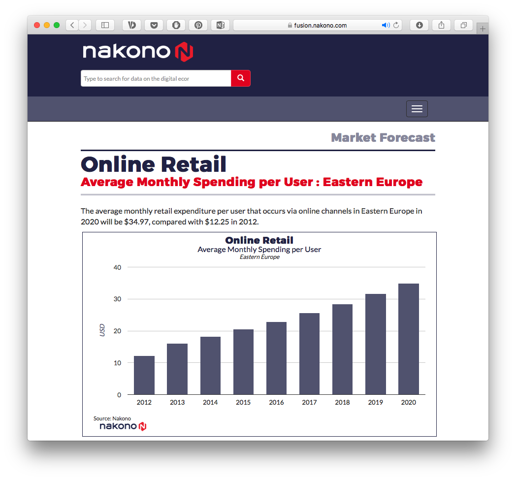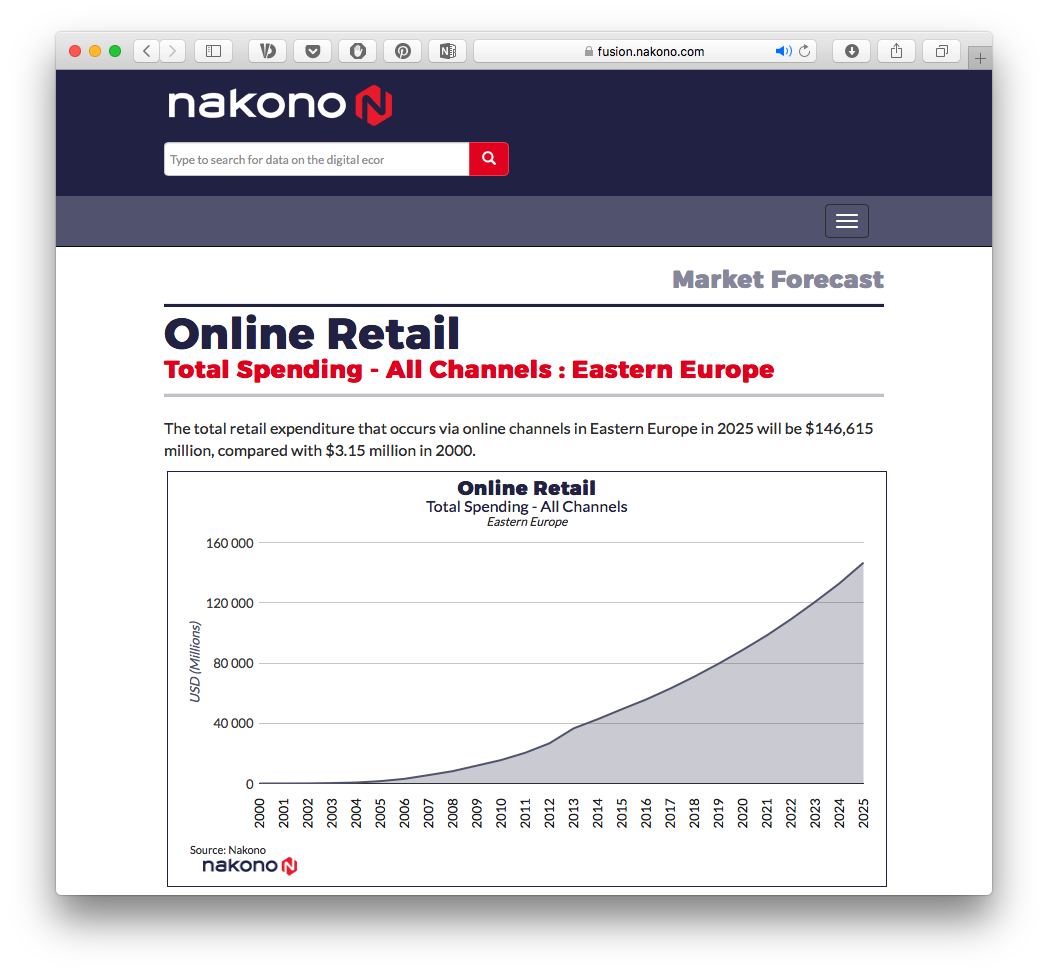 Середні щомісячні роздрібні витрати на одного користувача по покупкам, що проходить через цифрові канали в Східній Європі в 2020 році, складуть $34,97 у порівнянні з $12,25 в 2012-му. Загальні роздрібні витрати, що проходять через інтернет-канали в Східній Європі, в 2025 році складуть $146,6 млрд у порівнянні з $3,15 млн у 2000 році.