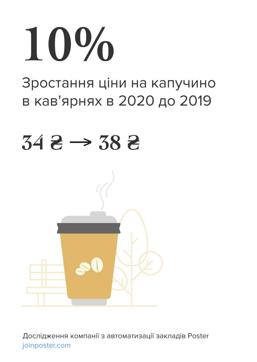 Незважаючи на пандемію, середня ціна на капучино в кав’ярнях України зросла на 10% – з 34 грн в 2019 році до 38 грн в 2020 році. Це зростання не покрило курсову різницю – курс долара до гривні за 2020 рік зріс на 19,4%.