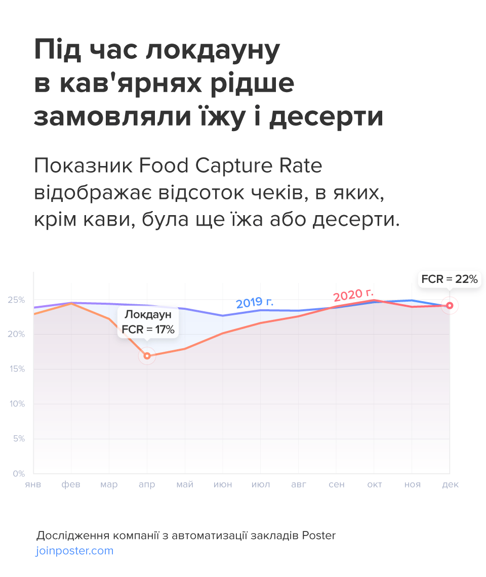 У 2019 році в 24% чеків крім кави пробивали ще їжу та десерти. Перший локдаун змінив споживчу поведінку: їжу й десерти стали замовляти рідше, показник Food Capture Rate в квітні 2020 року впав до 17%. До кінця року попит відновився. В середньому за 2020 рік їжу та десерти крім кави замовляли в 22% чеків.